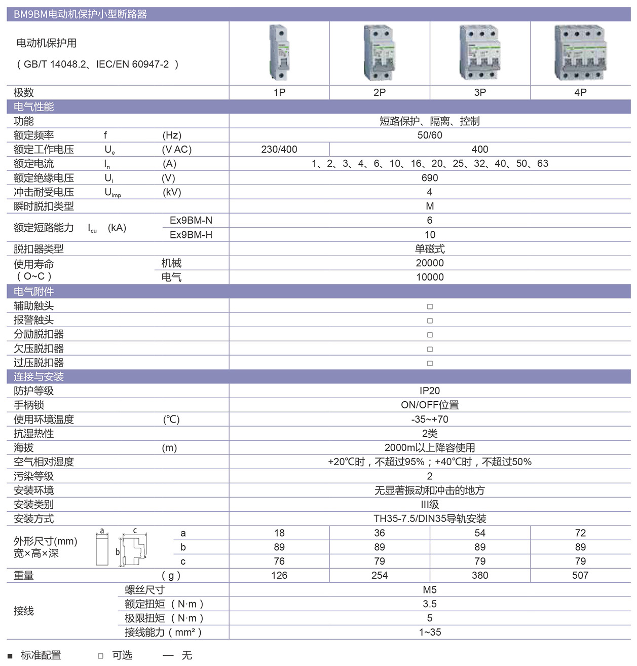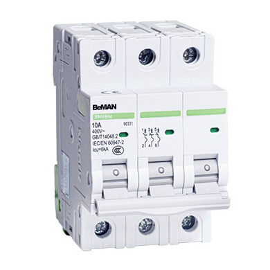 BM9BM小型断路器额定工作电压至400V,额定工作电流至63A,机械寿命20000次,电气寿命10000次,分断能力6kA/10kA。
